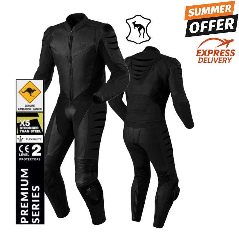 KANGAROO PREMIUM FX BLACK ONE-PIECE MOTORCYCLE LEATHER SUIT
