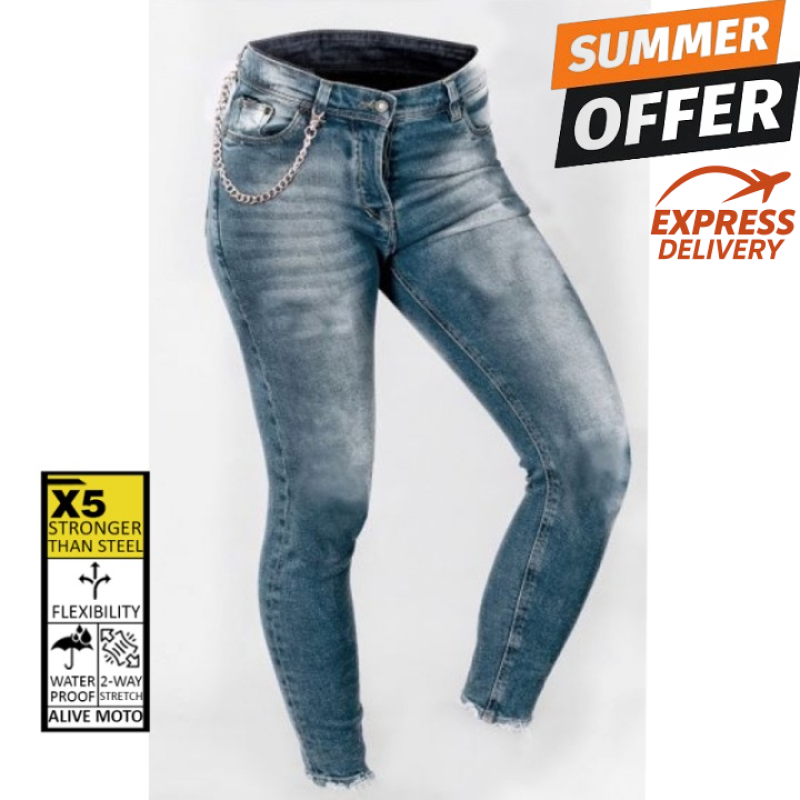Alive Moto lightweight composite stretch denim for outstanding fit and CE-approved Class A performance.